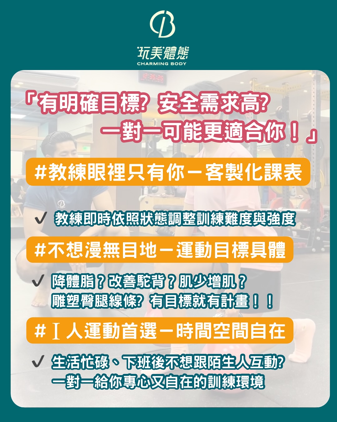教練一對一專注在你的訓練強度與動作控制,讓每一分鐘的運動都精準有效!
